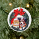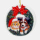 This cute Christmas ornament features a dog and a cat inside a Christmas wreath. The cat is wearing a Santa hat and the wreath has a big red bow on top. Cute for any animal lover in your life!