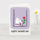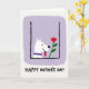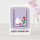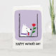 This card features a simplified white dog with pointed ears and a soft purple collar, peeking from behind a light lavender rectangular frame as if leaning in for a friendly hello ❤️. One black eye and a small curved smile give it a tender, eager expression, with a red tongue hanging out like it’s rushing to deliver a sweet surprise. Next to the dog stands a single red flower with two green leaves, positioned like a gentle offering between close companions. Behind them, a broad wash of pastel purple fills the background, enclosed by loosely drawn black lines that resemble a casual window outline. The painted shapes have slightly rough edges, adding a cozy, informal look. Along the bottom, the message “HAPPY MOTHER’S DAY!” sits centered in dark lettering, standing out clearly against the lighter space 🌼. The lavender border looks brushy and uneven, with the dog’s head and paws overlapping it as if stepping forward into the scene.