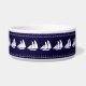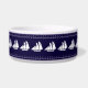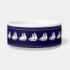 Dog bowl is shown in white with a navy-blue color accent strip with a cute sailboats & anchors print.