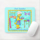 This cute dog art mousepad will be a delight while working on your computer. Personalized with a name and the word chef, its easy to customize for someone who loves to cook or is a chef. “A surprise for dinner” features the Chef Dog fixing a surprise, a bone wrapped with a candle, ready to serve. Is it for a birthday or just a special surprise? Chef Dog’s expression shows pride while serving the surprise. A bone shaped purple clock hangs on the wall with a rack of pots and pans. Fuchsia wrapping paper leans against the wall and a table holds ribbon and a blue bowl. The background is turquoise with green paw prints and has a yellow border with blue dots. Original art is by Phyllis Dobbs.