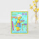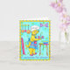 “A surprise for dinner” features the Chef Dog fixing a surprise, a bone wrapped with a candle, ready to serve. Is it for a birthday or just a special surprise? Its up to you! Chef Dog’s expression shows pride while serving the surprise. A bone shaped purple clock hangs on the wall with a rack of pots and pans. Fuchsia wrapping paper leans against the wall and a table holds ribbon and a blue bowl. The background is turquoise with green paw prints and has a yellow border with blue dots.