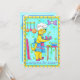 “A surprise for dinner” features the Chef Dog fixing a surprise, a bone wrapped with a candle, ready to serve. On the front of the invitation, Chef Dog’s expression shows pride while serving the surprise. Fuchsia wrapping paper leans against the wall. Pots and pans hang on the wall with a purple bone shaped clock. The background is turquoise with green paw prints and has a yellow border with blue dots. The back with a light turquoise background has the event information for you to complete for the invitation.