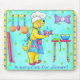 “A surprise for dinner” features the Chef Dog fixing a surprise, a bone wrapped with a candle, ready to serve. Is it for a birthday or just a special surprise? Its up to you! Chef Dog’s expression shows pride while serving the surprise. A bone shaped purple clock hangs on the wall with a rack of pots and pans. Fuchsia wrapping paper leans against the wall and a table holds ribbon and a blue bowl. The background is turquoise with green paw prints and has a yellow border with blue dots.