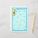 “A surprise for dinner” features the Chef Dog fixing a surprise, a bone wrapped with a candle, ready to serve. Share a favorite recipe or other special note. Chef Dog’s expression shows pride while serving the surprise. The background is turquoise with green paw prints and has a blue border.