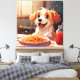 A fluffy white Dog , dappled with brown spots, dives headfirst into a mountain of spaghetti. Tomato sauce splatters across its fur and the white tablecloth in a delightful mess. Rendered in a stunning, masterfully balanced composition (think golden ratio!), the illustration evokes the detailed, yet whimsical