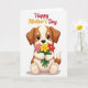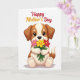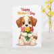 This card features a cute, cartoon-style puppy standing centered on a plain white background, holding flowers close as if offering them with a shy, affectionate glance ❤️. Its rounded body is colored in chocolate brown with creamy beige on the face and belly, and the smooth shading gives it a soft, cuddly look. Big dark eyes with tiny highlights and a small upturned smile create a tender, friendly expression. In its front paws, it presents a small bouquet of three flowers—one pink, one yellow, and one red—each with green stems gathered neatly together 🌼. The pup’s seated pose with little padded feet turned outward adds to the gentle, approachable mood, like it’s waiting for a warm hug in return. Above the character, the greeting “Happy Mother’s Day” is placed near the top, with “Happy” in bright red and “Mother’s Day” in warm orange lettering. Light gradients and soft highlights appear on the pup’s face, paws, and the flower petals against the open white space. The final detail is the trio of blossoms clustered in front of its chest, with the red flower slightly higher than the pink and yellow.