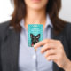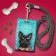 A cute black miniature schnauzer on bright turquoise with a white paw print border, this dog groomer business ID badge is a fun way to identify our personnel.