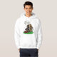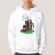 If you like dogs then you are going to love this design of a dog in his dog house dreaming of a bone. The dog is half in half out of the dog house with a bowl of food in front of him. However the dog is dreaming of other things and has a bone in a dream bubble above him. This dog house design looks great on this mens hoodie. Perfect for yourself or as a gift