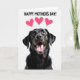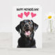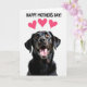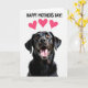 This card features a tall, vertical layout with a close-up portrait of a dark-coated dog looking upward as if gazing at someone it adores ❤️. Its wet, shiny nose and open, smiling mouth sit near the center, drawing your eye to the dog’s eager, affectionate expression. The fur reads as deep black with subtle warm brown hints, set against a bright white background that keeps the scene airy and focused. Near the top, the message “HAPPY MOTHER’S DAY!” appears in uppercase letters, set in a friendly, rounded style and colored in strong pink. Just above the dog’s head, three small pink hearts float like a sweet little thought bubble, adding a gentle romantic touch 🌼. The dog’s amber eyes catch tiny highlights, and the slight wrinkles around the muzzle add realism that makes the look feel tender and close. The background stays plain and uncluttered so the dog and greeting feel front and center. The three hearts are arranged in a loose cluster above the text, with soft rounded edges in bright pink.