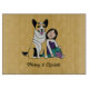 This yellow-dominant cutting board features an illustration of a young woman and a happy large breed dog leaning against each other. This is a great gift for a young female who owns a dog or who loves dogs in general.