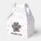 Dog paw print and heart watercolor in red, black and gray. Paint splatter background. Custom thank you favor boxes. Dog party decor idea.