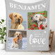 Featuring three of your favorite photos of your beloved dog, this blanket beautifully showcases the special moments you share. The phrase "All You Need is LOVE and a Dog" is elegantly printed, capturing the essence of your bond. To make it even more personal, we offer the option to add a monogram and your pet's name, ensuring this blanket is truly one-of-a-kind.