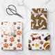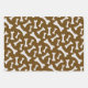 This set of all occasion wrapping paper sheets each have a distinct fun pattern of images pertaining to our favorite four legged friends. One paper has brown, orange, and gold dog foot prints on a white background. Another has white dog bones on a dark brown background. The third paper has dog bones, foot prints, a dog dish, a ball, and gold hearts on a white background. Perfect for many occasions celebrated by the dog lover!