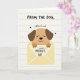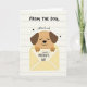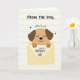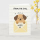 This card shows a cute cartoon dog with soft tan fur and dark brown floppy ears peeking out of a pale yellow envelope, as if shyly delivering a sweet note ❤️. The dog’s eyes are closed and its small smile suggests a tender, affectionate moment, like a gentle nuzzle captured on paper. Its little paws hold a white card in front, featuring a message for a mom in thick black lettering, alongside a simple stick-figure doodle. Above the illustration, more text appears in a casual hand-drawn style, reading “FROM THE DOG,” followed by “with lots of woof,” with tiny black hearts sprinkled nearby 🌼. The background is light cream with faint line texture, like stationery, keeping the scene soft and cozy. Warm browns, muted yellow, and crisp black ink keep the look simple while still feeling close and friendly, like a small gesture between family members. The envelope sits centered beneath the dog, and the black text is placed above and on the white card for easy reading against the pale background. Small black heart shapes dot the space around the upper words and near the message area.