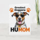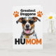 Designed with a bright white background, this card centers on a cheerful spotted dog with tan patches looking straight ahead, mouth open in a friendly grin with a peek of pink tongue ❤️. Dark sunglasses with a dotted pattern sit across its face, echoing the matching pattern on its collar for a coordinated, affectionate look. A small golden, bone-shaped tag hangs at the collar, adding a sweet, gift-like touch that feels like a little thank-you between close companions. Above the dog’s head, a line of large black text stretches across the top, with a few key letters highlighted in warm orange to draw the eye. Below the portrait, another bold black line of text repeats the praise, again punctuated by orange letters for emphasis. Two orange paw-print icons sit near the upper corners like cheerful corner stamps 🌼. The lighting is bright and even, bringing out the fur texture, the glossy lenses, and the crisp edges of the black-and-orange lettering against the white space.