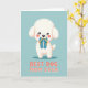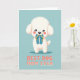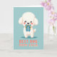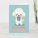 This design shows a fluffy cream-colored dog in a soft-edged cartoon style, with gentle uneven outlines that make its fur look extra cuddly ❤️. The dog has large dark eyes and a faint pink blush on its cheeks, giving it a tender, affectionate look as if it’s offering a small surprise to someone it adores. A pair of bright blue and yellow thong sandals hangs from its mouth, held carefully like a gift being carried home. The background is a calm light teal, keeping the scene simple so the pale fur and colorful sandals stand out. Centered below the dog, rounded uppercase text reads “BEST DOG MOM EVER” in a warm coral color. The lettering sits low on the card with plenty of open space above it, guiding your eyes from the dog’s face down to the message. Small touches of pink in the cheeks and the sunny sandal accents add a friendly, close-to-the-heart feel 🌼. The dog is positioned above the coral phrase against the teal field, with the blue-and-yellow sandals angled slightly to one side.
