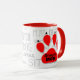 Add your dog's name to this Dog Mom mug with a bold red dog paw print and faded dog lover words on white.