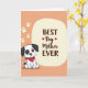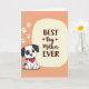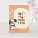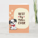 Designed with a sweet digital illustration, the card shows a stylized puppy nestled at the lower left, partly overlapping a large cream-colored rounded shape on the right, creating a cozy, affectionate focus ❤️. The left side is filled with a soft peachy-orange background where small white paw prints drift upward, like a trail leading your eyes across the design. The puppy has a white coat with black patches on its floppy ears and a single black patch around one eye, giving it an endearing, slightly lopsided look that feels friendly and close. One eye is winking while the other looks bright and gentle, with a touch of pink blush on its cheeks that suggests a tender, teasing bond. Around its neck is a red bandana tied in a neat knot, adding a warm pop of color beside the softer tones 🌼. On the cream shape, the main message reads “BEST Dog Mother EVER” in dark brown lettering, centered and sized large for easy reading. Small red hearts sit near the words as accents, echoing the bandana and adding little romantic touches. The overall layout is split left-to-right with paw prints on peach and the text on cream, while the puppy overlaps the boundary for a layered, cuddly effect.