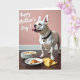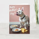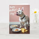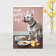 This card shows a bright white small dog with upright ears and a compact build standing on a dark wooden floor, casting a mischievous glance toward a stack of white plates nearby. Golden crumbs are scattered across the plates, and one partly eaten sweet treat sits on the lowest dish, hinting at a naughty little “caught in the act” moment that feels affectionately familiar ❤️. A crumpled yellow napkin rests beside the plates, adding a sunny splash of color against the deeper tones of the floor. The background is a soft blush-pink wall, and gentle, diffused light smooths the scene while bringing out the dog’s fur texture and the shine of the wood. The dog’s pink tongue sticks out as if it just finished a secret taste, giving the scene a friendly, companionable energy like a shared inside joke. In the upper left, the text “Happy Mother’s Day!” appears in white lettering, floating clearly against the pink wall. A thin dark collar circles the dog’s neck, finished with a small golden charm, and a few stray crumbs sparkle near the edge of the stacked plates 🌼.