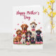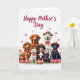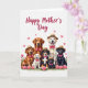 This card features six upright, humanlike dogs gathered shoulder to shoulder along the lower half of a bright white background, creating the feel of a close-knit family portrait with a friendly, affectionate energy ❤️. Their coats range from golden brown to creamy white to deep black with tan accents, and each one wears a straw-toned fedora and a neatly tied pink bow tie, as if they dressed up together for someone they adore. The dogs’ soft eyes and slight smiles suggest a shared fondness, with the central cream-colored pup shown with an open, happy mouth that draws attention like the group’s cheerful anchor. Near the top, the words “Happy Mother’s Day” appear in flowing fuchsia lettering, centered above the group. Small pink hearts float nearby, lightly scattered across the open space to echo the warm bond between them 🌼. Along the bottom edge, a strip of fresh green grass grounds their paws and adds a gentle outdoor touch. Clusters of rosy pink flowers with layered petals sit in the grass, framing the scene with color. The hats are a light straw beige with darker bands, and the flowers are arranged in small bunches across the base.