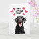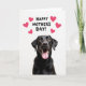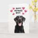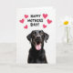 This card features a dark-furred dog in a tall layout, set against a bright white background that makes the portrait stand out. The dog fills the lower half, facing forward with a slight head tilt and an open-mouthed grin that feels like an eager, friendly greeting ❤️. Its glossy black coat contrasts sharply with the background, while warm amber eyes catch small highlights that make the gaze seem tender and attentive. A pink tongue shows as it pants, adding a sweet, lively touch without needing any extra scenery. Near the top, the phrase “HAPPY MOTHER’S DAY!” appears in uppercase letters in a casual, hand-drawn look, spaced clearly across the upper area. Around the text, six deep pink hearts float like little notes of affection, giving the design a gentle romantic accent 🌼. The hearts are scattered above the dog’s head, with soft rounded shapes in deep pink against the white space.