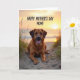 This card features a medium-sized dog with reddish-brown fur lying on warm sand, looking straight ahead with a wide, friendly grin that feels like an affectionate hello ❤️. Its dark eyes and relaxed paws suggest a loyal companion settling in close, as if waiting beside someone it adores. Behind the dog, the sea stretches out under a low sun, with the horizon washed in oranges and soft yellows like early morning or late evening. Gentle light skims across the sand, bringing out small ripples and grains, while tufts of beach grass edge the scene like a quiet frame. Near the top, the message “HAPPY MOTHER’S DAY MOM!” is placed in large, dark lettering that stands out against the glowing sky. The casual letter style adds an easy, friendly tone, like a note written with a smile and a warm squeeze of the hand 👩. The dog’s pink tongue and a glimpse of white teeth brighten the center, drawing your eye back to its cheerful face. Wispy grass blades and the smooth shoreline sit beneath the orange-yellow sky in the background.