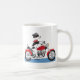 A dog is riding a red motorcycle. His ears, scarf and tail are flying in the wind and his helmet has bone decals.