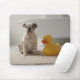 Dog on mat with plastic duck mouse pad