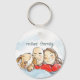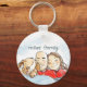 This keychain has an illustration of a cute puppy and its parents, a bald man and a brunette woman. You can customize the text.