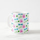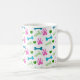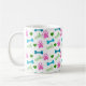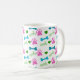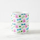 Are you looking for a gift for the dog lover in your life? They'll love this cute mug that has a hand drawn pattern of pink dog paws, blue bones, green hearts and the word woof in green.