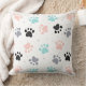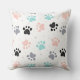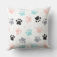 This design features pink blue and gray dog paw prints in a seamless pattern over a white background.