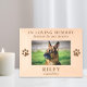 Elegant laser-etched wood photo frame to honor the memory of your loyal companion featuring the heartfelt inscriptions "In Loving Memory" and "Forever in Our Hearts" in classic serif typography, paw prints, their name and your personal sentiment.