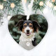 Custom heart shaped commemorative Christmas ornament features a photo of your best furry friend with a simple and modern first name monogram and paw print accent in white. Personalize the design for your new puppy, your family's dog, or in loving memory of a special pet.