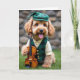 Designed with a fluffy golden-brown dog front and center, this St. Patrick’s Day scene feels like an outdoor portrait where a friend is about to steal the show 💚. The dog wears a deep green plaid vest with shiny gold buttons over a cream shirt, topped with a matching cap that sits slightly jaunty on its head. Its eyes meet yours with a bright, knowing look, and the open grin with a pink tongue peeking out reads like a friendly tease. In its left paw, it carefully holds a tiny violin, the warm wood catching the daylight as if it’s ready to play a tune for someone special ☘️. The close, eye-level view makes the moment feel personal, like you’re standing just a step away while it performs. The greeting appears near the top in green lettering, with a smaller line of text placed near the bottom in gold to echo the vest buttons. Behind the dog, soft-focus green grass and a rustic stone wall sit under gentle daylight.