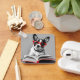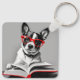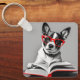 Black and White Picture of a dog Reading a read with a color splash of red glass frame a book cover