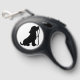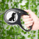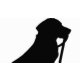 Black silhouette of a dog sitting with a leash in its mouth, the background is plain white.