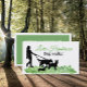 Dog walker themed business card done in white, with watercolor graphics of green grass, and black silhouette graphics of a dog walker with three dogs. All text is fully customizable. Personalize this fun card for your business.