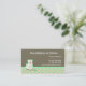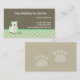 Business card for dog walkers and other pet care professionals. Brown and green design with fully customizable text. Cute polka dotted dog is holding his leash and wagging his tail.