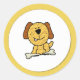 A sweet cartoon puppy dog with a bone on a white background with a yellow border