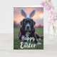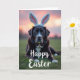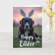 This card shows a dark-furred dog lying calmly on a bright green lawn, looking straight at the viewer with a steady, affectionate gaze 🐇. Deep brown fur is highlighted by crisp white markings on the face and chest, giving the portrait strong contrast without feeling harsh. A fluffy headband with long bunny ears in white and soft pink sits on its head, adding a sweet, friendly touch that feels like an inside joke shared with someone close 🐰. Gentle natural light washes over the scene, warming the grass and catching subtle shine in the coat. Behind the dog, the sky is painted in a smooth gradient of rose, peach, and pale violet, like early morning or late evening. Seasonal greeting text sits near the top against the sky in a light-colored font that stays easy to read, with smaller supporting words placed lower near the horizon in a softer tone. The dog’s amber-gold eyes stand out as the most intimate detail, as if it’s posing patiently for a loved one. Individual blades of grass are sharp in the foreground, while the background softens into a pastel sky with the bunny ears outlined clearly against it 🌷.