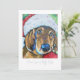 Painting of an adorable hound dog wearing a Santa Hat featured on a holiday note card with the inscription "Peace, Love & Belly Rubs"