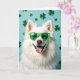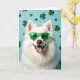 This greeting card shows a fluffy white Samoyed-like dog centered in the scene, wearing green sunglasses with white horizontal stripes and smiling with a pink tongue peeking out. The dog’s bright, friendly gaze and open-mouthed grin feel like an eager hello to a close friend, as if it’s posing just for you 💚. Behind it, a cool aquamarine background is sprinkled with soft green shamrock shapes at different sizes and blur levels, giving a St. Patrick’s Day setting ☘️. Light falls evenly across the fur, picking out gentle texture along the cheeks, chest, and ears while keeping the overall look light and airy. A short St. Patrick’s Day message sits near the top in green lettering, balanced so it doesn’t crowd the dog’s face. The text is easy to spot against the blue-green backdrop, with the shamrocks drifting around it like confetti. The green shades sit straight across the dog’s eyes, with crisp white stripes running left to right.