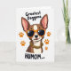 This card features a small, upright-eared dog in a bust-style portrait, set against a plain white background that keeps the focus on its face. The brown-and-cream coat is outlined with sharp, simple lines, and the dog wears orange-framed sunglasses with dark lenses that catch a single round highlight, as if it’s sharing a secret glance with someone it adores ❤️. A chunky gold-link chain rests at its neck, adding a flashy touch that feels like a friendly wink rather than a boast. Warm orange paw prints sit around the edges in a balanced arrangement, echoing the sunglasses color and framing the dog like little affectionate stamps 🌼. Across the top, rounded black lettering curves above the head reading “Greatest Doggone,” placed like a gentle crown. Near the bottom, matching rounded black text reads “HUMOM....,” centered beneath the chin with plenty of white space around it. The orange paw prints repeat at the sides and corners, evenly spaced against the white backdrop.