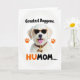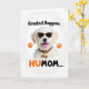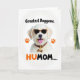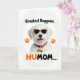 Designed with a bright, friendly look, this card features a light-furred dog shown from the shoulders up on a white background, wearing dark sunglasses that give it a flirty, best-friend energy ❤️. Its mouth is open with a pink tongue sticking out, as if it’s mid-laugh and leaning in for attention. The sunglasses have a high-contrast speckled frame, and a matching speckled collar circles its neck with a small bone-shaped charm hanging at the center. Two orange paw prints sit on either side of the dog, adding a cheerful pop of color 🌼. Near the top, the phrase “Greatest Doggone.” appears in dark lettering, spaced neatly above the dog’s head. Along the bottom, “HUMOM….” is set in a mix of dark and warm orange text, aligned beneath the portrait like a caption. The lighting stays bright and even, and the orange paw prints are placed symmetrically to the left and right of the dog’s face.
