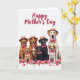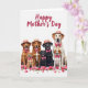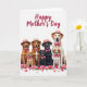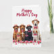 This card shows six friendly dogs gathered on a bright white background, arranged with three slightly larger pups standing behind and three smaller ones posed in front as if leaning in close like old friends ❤️. Each dog wears a straw hat with a soft pink ribbon and a pink bow tie, and their bright eyes and open, panting smiles give the group an affectionate, together-at-once feeling. The fur colors vary from warm golden to deep black, creamy white, and speckled brown, standing out clearly against the pale setting. Along the bottom edge, scattered blossoms in pink and deep red form a low floral border that feels like a gentle celebration 🌼. Near the top, the words “Happy Mother’s Day” are placed prominently in magenta lettering, centered above the dogs. The matching pink accents in the hats and bow ties echo the text color, tying the whole layout together. The flowers cluster most densely across the base of the image, with petals and small blooms spreading outward beneath the front row of dogs.
