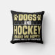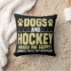Hockey theme throw pillow with text that reads Dogs and Hockey Make Me Happy Humans Make My Head Hurt! Also features some hockey sticks and dog paw prints!