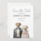 Whimsical illustration of a groom's dog in an elegant suit and a bride's dog with a pink bow