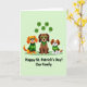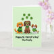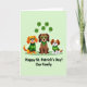 This card shows three friendly, human-like dogs lined up across the center on a pale mint-green background, dressed up for St. Patrick’s Day with an easy closeness between them 💚. The golden dog on the left wears a chunky green sweater dotted with shamrocks and green-rimmed glasses, leaning slightly toward the others like a pal who’s ready for a group photo. In the middle, a darker brown dog stands calmly with a green bandana and matching glasses, giving the side dogs a steady, affectionate glance. On the right, the smaller white-and-brown dog wears a green striped sweater and angles in toward the center, adding a youthful, buddy-to-buddy warmth. Near the bottom, the message “Happy St. Patrick’s Day! Our Family,” sits as a single line in green, centered beneath the trio and easy to read. Above their heads, several green shamrocks drift like confetti, tying the outfits and background together ☘️. The lighting is bright and even, with crisp outlines and simple shading that keeps the dogs’ faces and clothes clear. A loose cluster of shamrocks floats near the upper area of the pale mint backdrop.