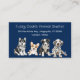 Business cards with dogs design, and animal theme, on dark, navy blue color. Text is light gray, to customize in two places. Four pups sit along the bottom of horizontal cards and they include, Husky / Malamute, Corgi, Border Collie, and Dalmation breeds. The back of the cards is solid gray.