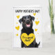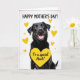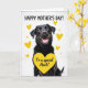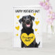 This card shows a dark-coated dog centered on a bright white background, looking out with warm amber eyes and an open-mouthed grin that feels like a friendly hello ❤️. Small yellow hearts float around its head and shoulders, giving the scene a light, affectionate energy, like the dog is basking in attention. The glossy black fur is shaded to show soft highlights, and the pink tongue adds a sweet, welcoming touch. Near the bottom, a large yellow heart anchors the layout, carrying a short Mother’s Day message that mentions an aunt in simple, easy-to-read lettering. The text sits neatly inside the heart, with dark lettering that stands out clearly against the yellow. A few smaller hearts trail upward from the big heart, like little notes of affection drifting into the air 🌼. A muted lavender border with a gentle texture frames the edges of the design.